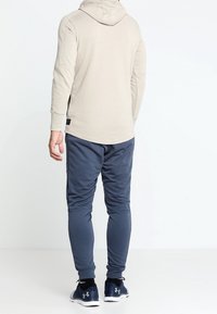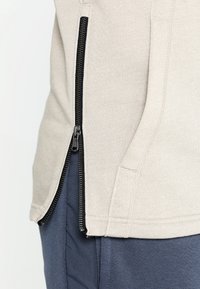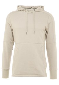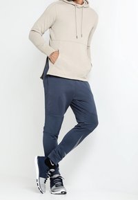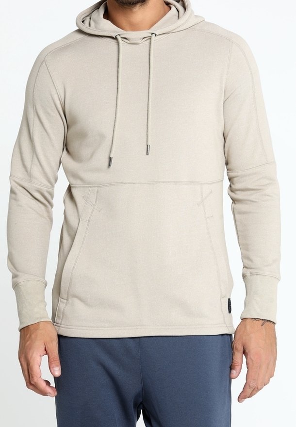 Homme portant un sweat à capuche beige avec poches avant et cordons de serrage, associé à un pantalon bleu foncé, debout devant un fond blanc.