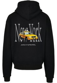 Sweat à capuche noir avec une poche kangourou à l'avant, une capuche à cordon et un texte indiquant « PERMIS DE CHAUFFEURS DE TAXI EXPIRANT LE : 31 MAI 1991 ».