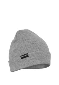 Bonnet en tricot côtelé noir avec une petite étiquette "Urban Classics". Le modèle porte une veste noire et un t-shirt blanc. Le fond est gris uni.
