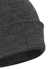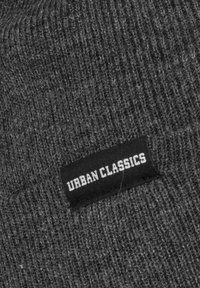 Jeune homme aux yeux clairs portant un bonnet gris Urban Classics, une veste noire et une chemise blanche, sur un fond gris neutre.