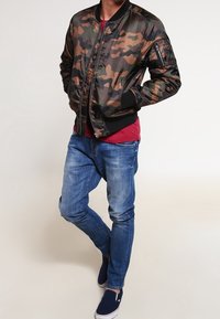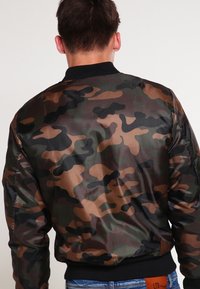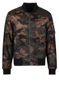 Veste bomber camouflage en matière brillante, dotée d'une fermeture éclair, de poignets côtelés et d'un mélange de motifs verts, bruns et noirs.