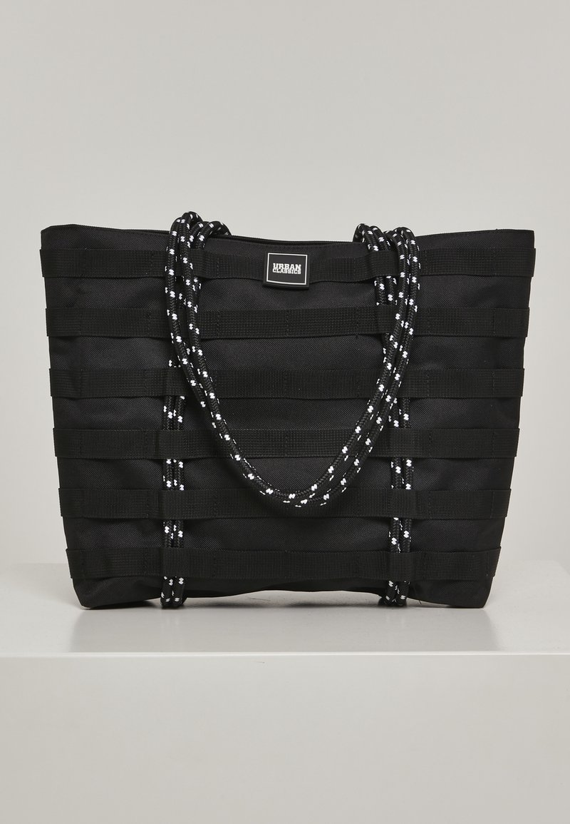 Sac fourre-tout noir avec un design en tissu tissé, présentant des rayures horizontales texturées et des poignées en corde robustes noires et blanches. Étiquette affichée de manière proéminente.