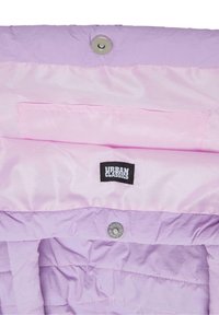 Sac fourre-tout matelassé violet avec deux poignées courtes, présentant une texture lisse et un motif de couture horizontale.