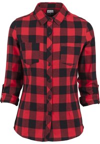 Chemise en flanelle à carreaux rouges et noirs avec un bouton sur le devant, manches longues et deux poches poitrine, associée à un pantalon cargo noir.