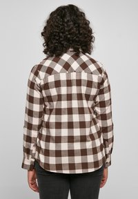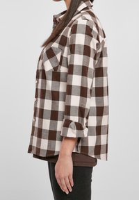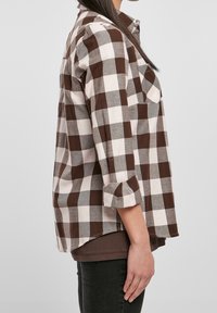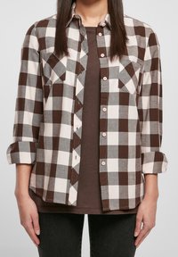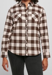 Femme portant une chemise boutonnée à carreaux marron et blanc sur un top marron, avec les manches retroussées et un pantalon noir.