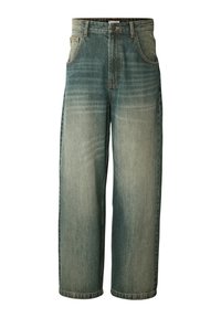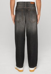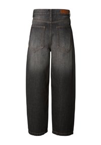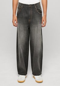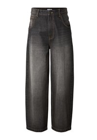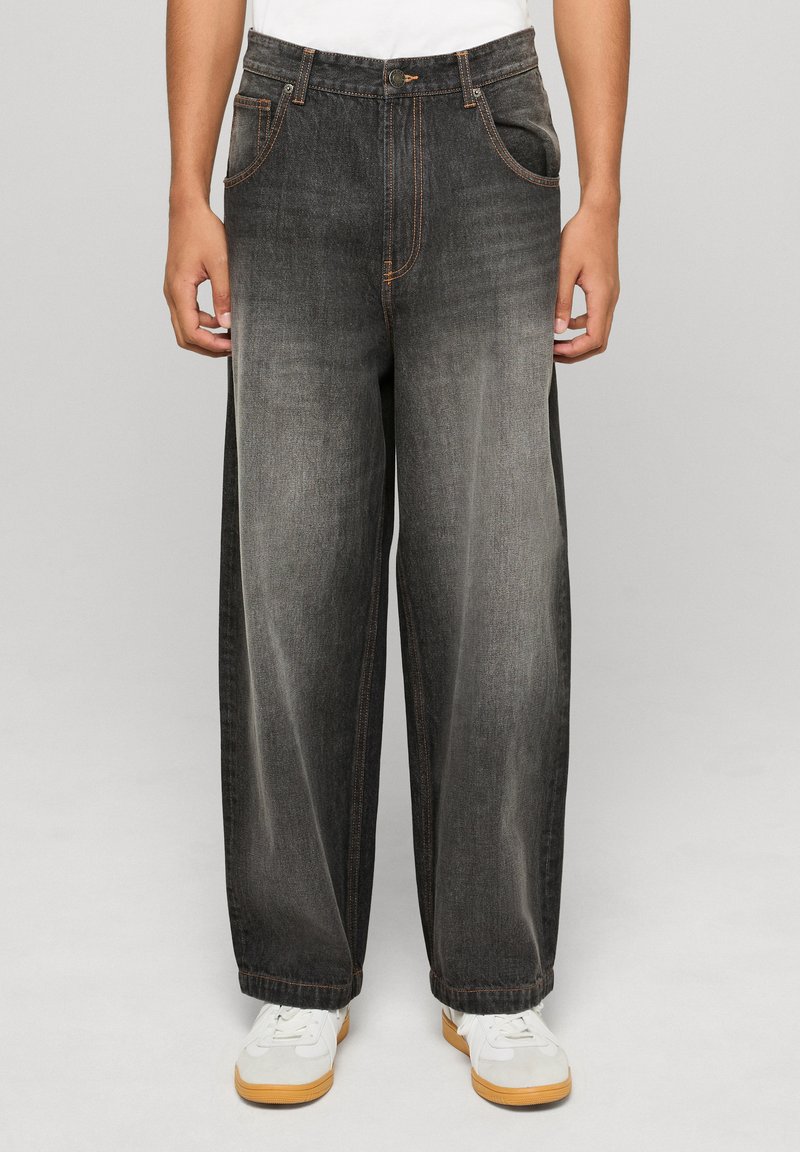 Jean denim gris foncé ample avec texture délavée, coutures orange, cinq poches et fermeture à boutons, associé à des baskets blanches.