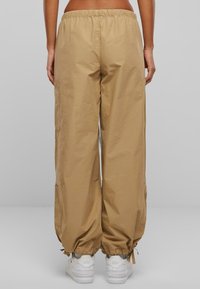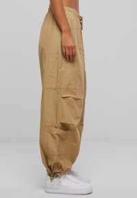 Pantalons cargo beiges avec une taille élastique et un cordon de serrage. Dotés de poches latérales et de bas resserrés. Portés avec des baskets blanches.