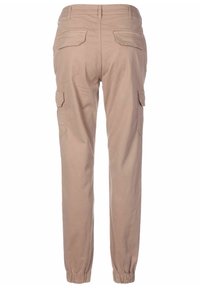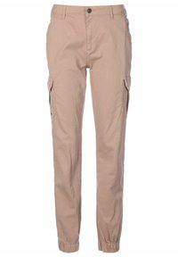 Pantalon cargo beige avec fermeture par bouton et fermeture éclair, poches à rabat latérales, passants pour ceinture et poignets élastiques aux chevilles.