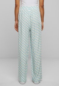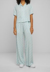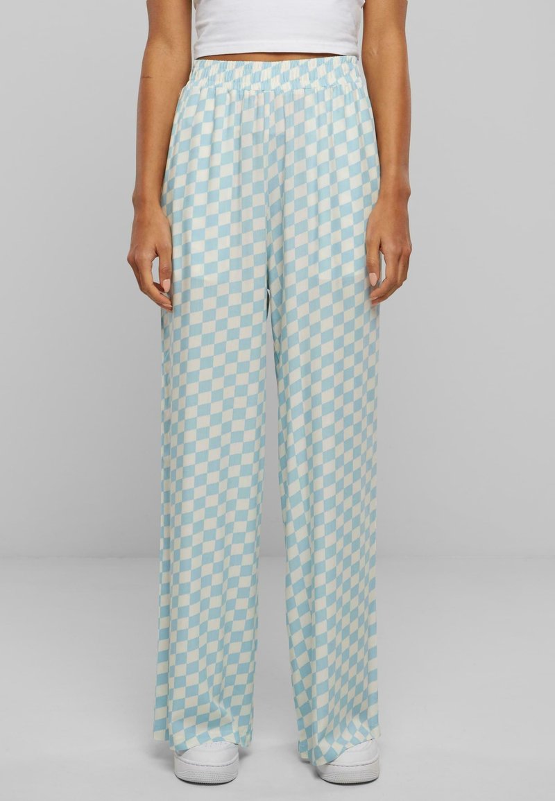 Pantalons larges à carreaux bleu clair et crème avec une taille élastique et une texture douce, associés à des baskets blanches.