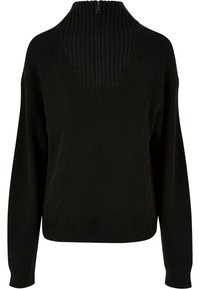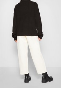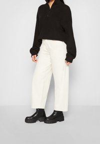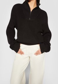 Pull noir en maille épaisse avec un col montant à demi-fermeture éclair et des manches longues, associé à un pantalon large écru.