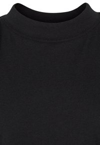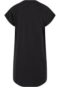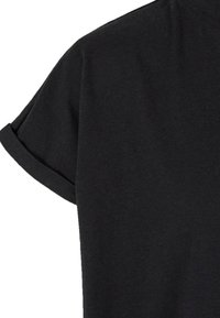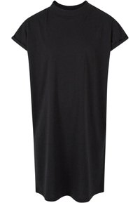 Robe t-shirt noire à manches courtes, longueur genou, avec des manches retroussées et un col rond, sur fond blanc.
