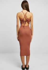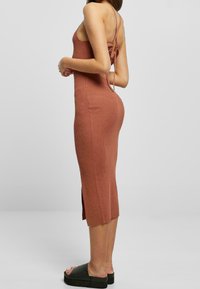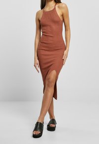Robe midi côtelée sans manches couleur rouille, coupe slim, avec une fente à l'avant, portée avec des sandales à plateformes noires, sur fond neutre.