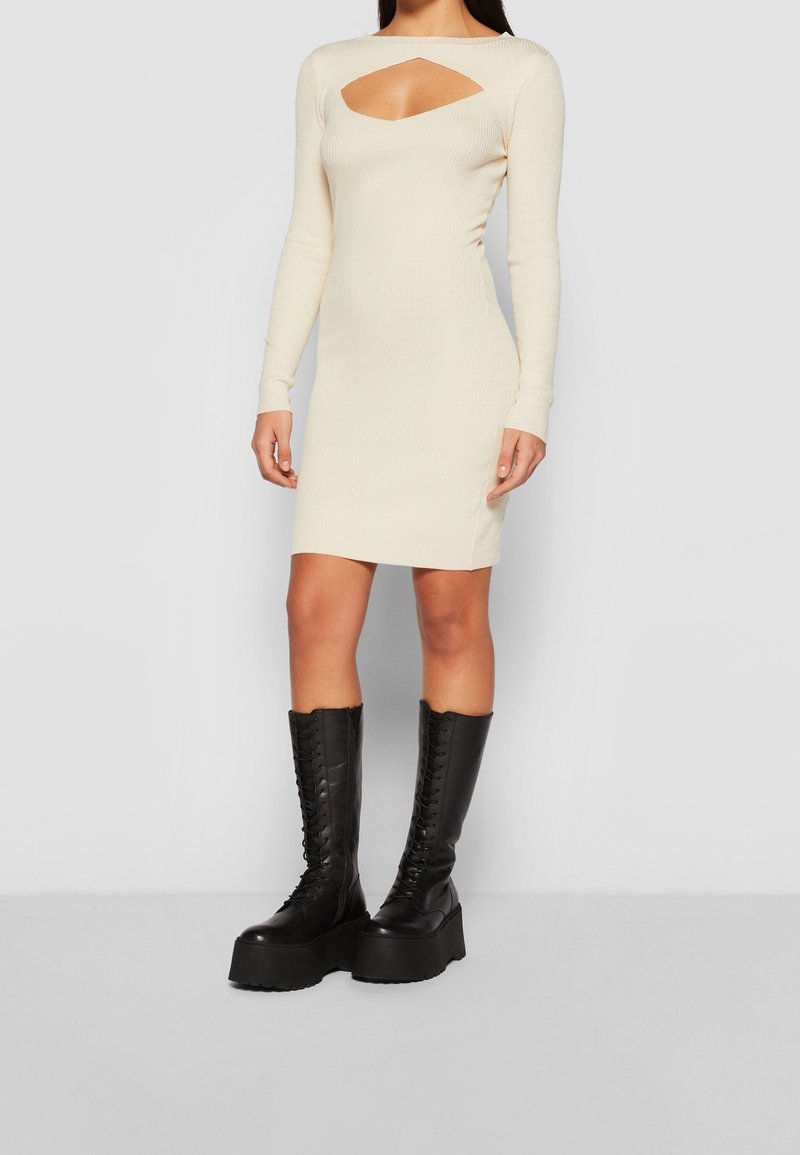 Femme portant une robe midi à manches longues en tricot côtelé beige avec un col montant et une découpe sur la poitrine, assortie à des bottes beiges et un bracelet en or.