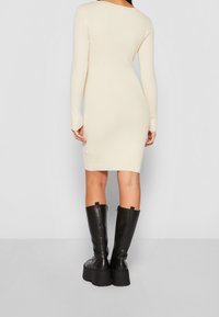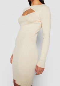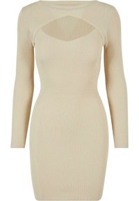 Robe en tricot côtelé de couleur beige neutre, avec des manches longues et un col haut, présentant une silhouette ajustée. Texture douce sur l'ensemble.