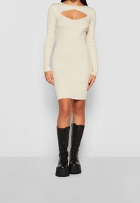 Femme portant une robe beige à manches longues côtelée avec une découpe poitrine et des bottes à lacets noires à plateforme montant jusqu'aux genoux.