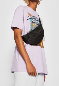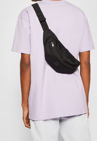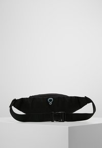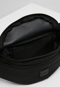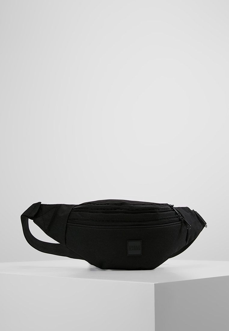 Sac banane en tissu noir à design incurvé, avec plusieurs compartiments zippés et un patch logo rectangulaire. Surface texturée.