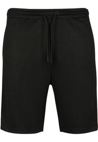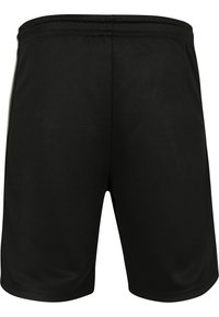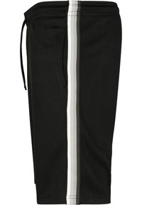 Shorts de sport noirs en tissu doux, dotés d'une taille élastique avec cordon de serrage et d'accents de panneaux latéraux dans une teinte plus claire.
