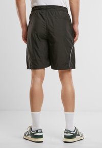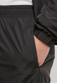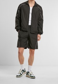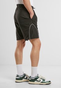 Shorts de sport noirs avec une taille élastique, présentant des bandes blanches sur les côtés et une texture légère et lisse. Portés avec des baskets et des chaussettes blanches.