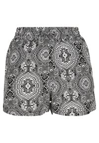 Shorts à motif noir et blanc avec une taille élastique, de coupe ample et décorés d'un motif floral. Portés avec des baskets blanches.