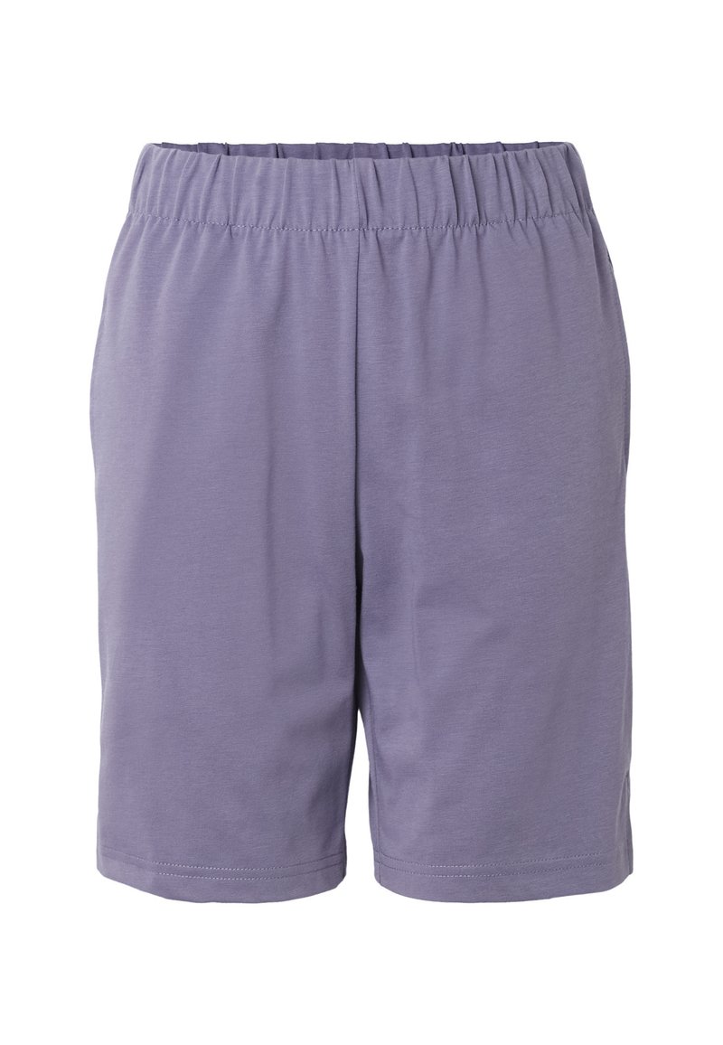 Shorts lavande longueur genou avec taille élastique et coutures simples, fabriqués en tissu doux et léger.