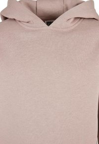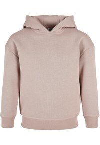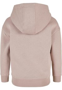 Sweat à capuche rose pâle à manches longues avec une poche avant, des poignets et un ourlet côtelés, et une capuche pliée, présenté sur un fond blanc.
