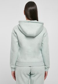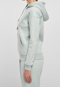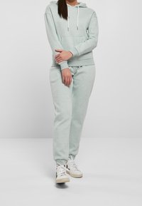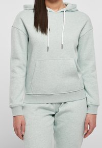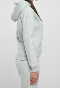 Personne portant un sweat à capuche gris clair et un pantalon de survêtement assorti, debout avec les bras détendus le long du corps devant un fond uni.