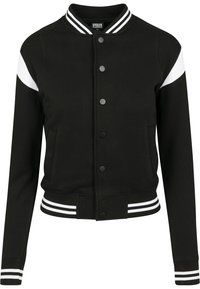 Veste bomber noire avec des accents blancs, fermeture à boutons-pression, col et poignets côtelés rayés, et poches sur les côtés, en tissu texturé.