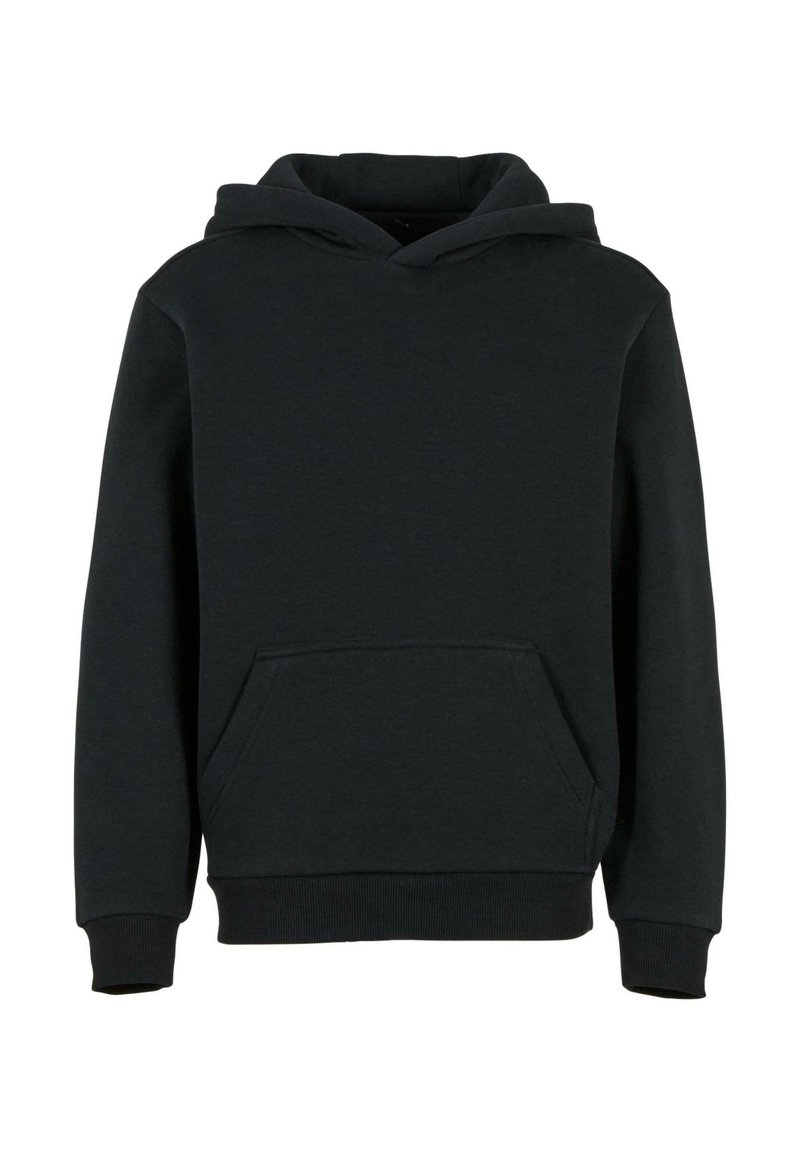 Sweatshirt à capuche noire en tissu doux, avec une poche kangourou, des poignets et un ourlet côtes, et une coupe décontractée.