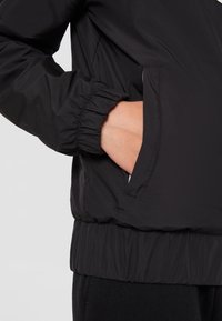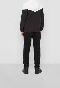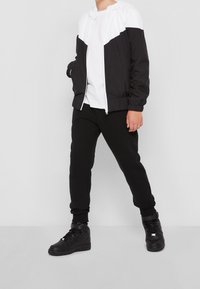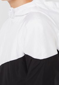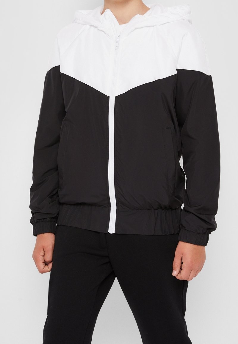 Veste coupe-vent noire et blanche avec fermeture éclair, capuche, poignets élastiques et un motif en chevron sur la poitrine.