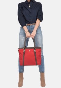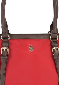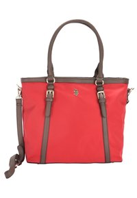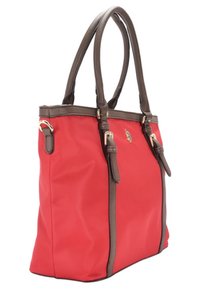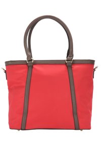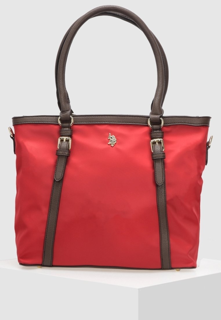 Sac fourre-tout synthétique rouge avec accents en cuir marron, double poignée et logo décoratif en or. Présente un design structuré et spacieux.