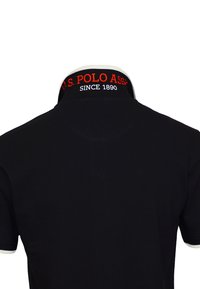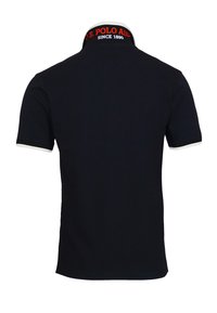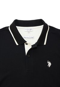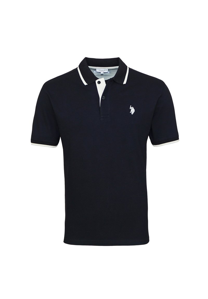 Polo noir avec un col et des ourlets de manches blancs. Contient un petit logo brodé sur la poitrine gauche. Matériau en coton.