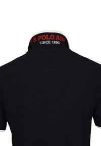 Polo en coton de couleur marine avec un col et des poignets de manche blancs contrastants ; présente un petit logo brodé sur la poitrine.