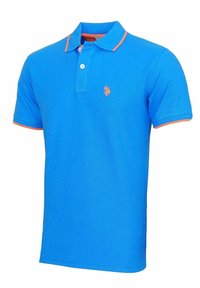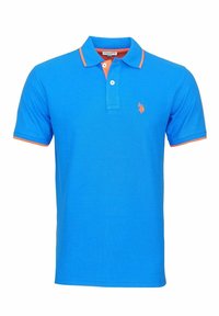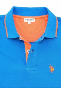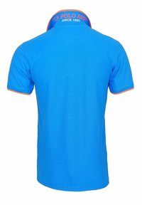 Polo shirt bleu à manches courtes avec des bordures orange sur le col et les manches, deux boutons blancs et un petit logo orange brodé sur le côté gauche de la poitrine.