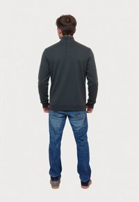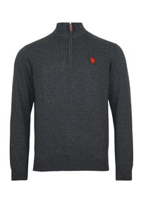 Pull à fermeture quart-zip texturé gris foncé avec un emblème de feuille rouge sur le côté gauche de la poitrine, porté avec un jean denim bleu, visible du cou jusqu'aux hanches.