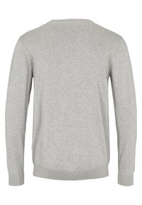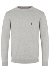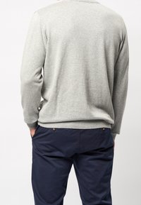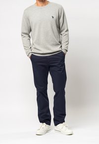 Homme portant un pull à col rond gris clair avec un petit logo sombre sur la poitrine et un pantalon bleu marine, debout avec une main dans la poche.