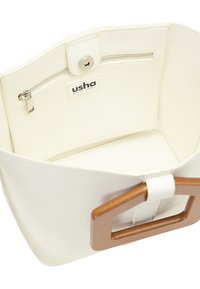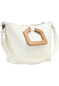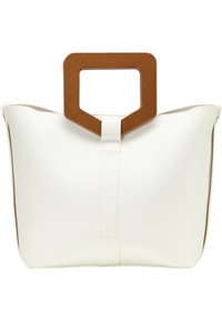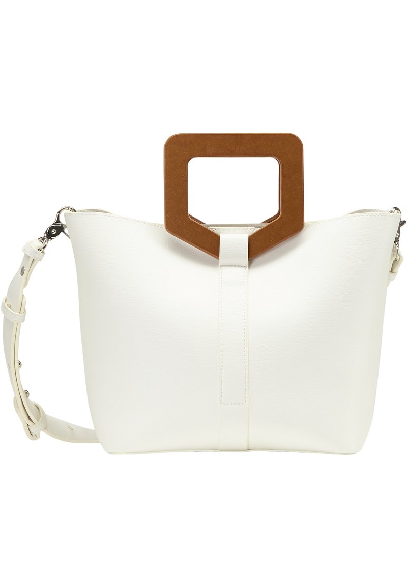 Sac à main structuré blanc avec une poignée supérieure en matériau brun, doté d'une bandoulière détachable et d'une texture lisse.