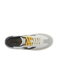 Baskets avec une tige en cuir blanc, des accents en suède gris, des détails noirs, des lacets jaunes et une semelle en caoutchouc texturée blanc cassé.