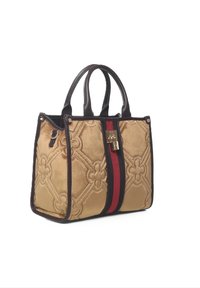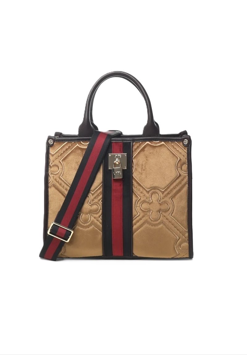 Sac à main en cuir texturé beige avec bordure noire, rayure verticale rouge et noire, fermoir doré, et bandoulière réglable avec boucle dorée.