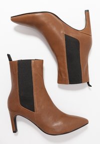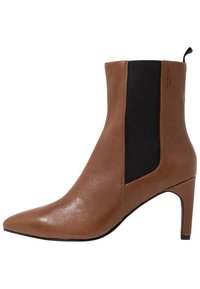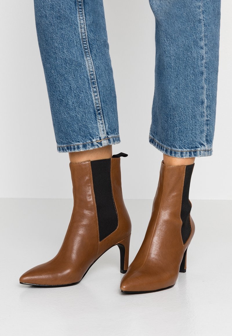 Bottes courtes en cuir marron avec des bouts pointus, dotées de panneaux latéraux élastiques noirs et d'un talon stiletto. La texture est lisse avec une finition brillante.