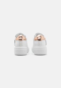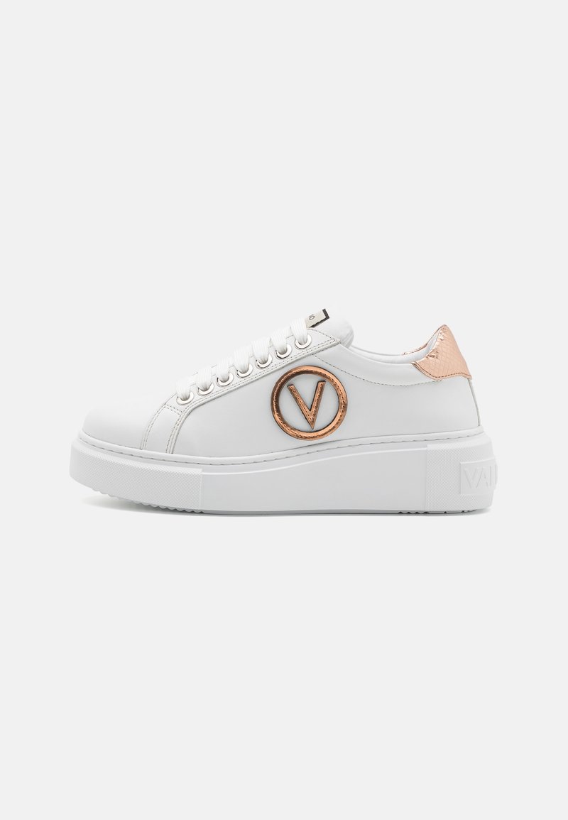 Baskets à plateforme blanches avec logo "V" en rose doré sur le côté et accent talon en rose doré, lacets blancs et semelle texturée.