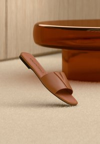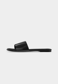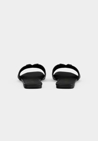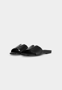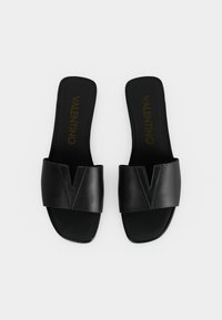Sandale noire Valentino à bout ouvert posée sur un tapis beige avec une table ronde marron dans une pièce éclairée doucement et neutre.