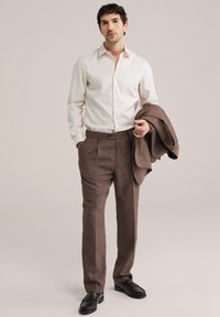 Homme aux cheveux courts et bouclés portant une chemise crème boutonnée rentrée dans un pantalon marron taille haute plissé, mains dans les poches.