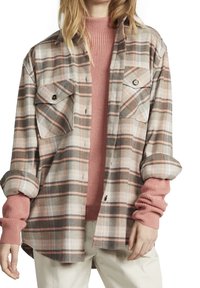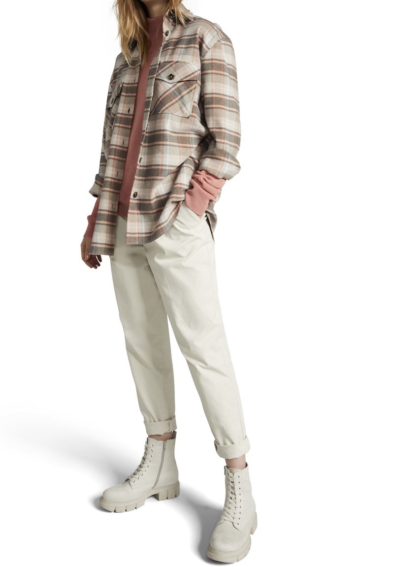 Femme portant une chemise à carreaux beige sur un pull rose poussiére, un pantalon roulé blanc cassé et des bottes à lacets épaisses blanc cassé sur fond blanc.