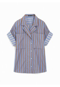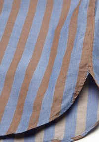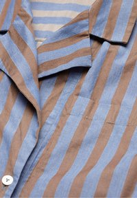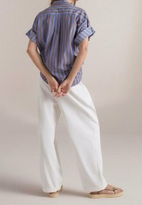 Chemise à rayures bleues et brunes à manches courtes associée à un pantalon blanc plissé taille haute et des sandales à plateforme beige. Tissu lisse, coupe décontractée.