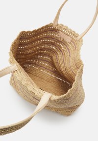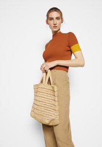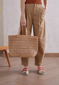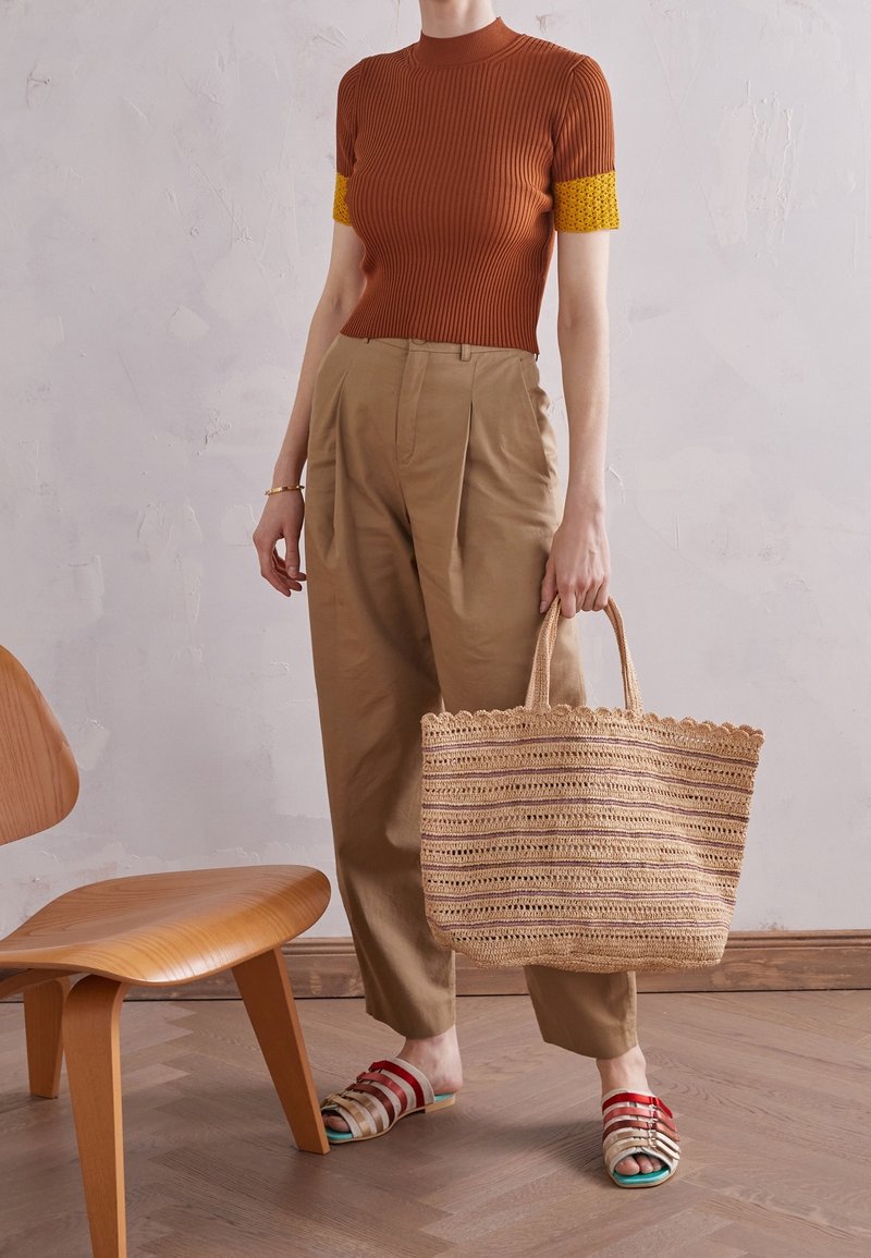 Haut à manches courtes côtelé marron avec accents jaunes, pantalon plissé beige, sac cabas en paille et sandales rayées multicolores.