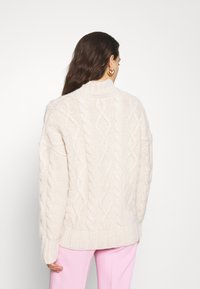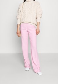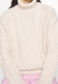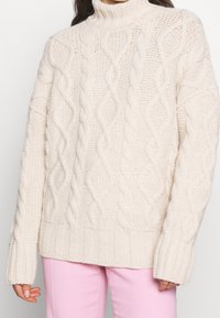 Femme portant un pull col roulé en maille torsadée crème associé à un pantalon rose clair sur un fond uni.