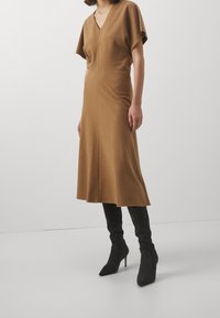 Femme portant une robe midi marron à col en V et manches courtes, associée à des bottes noires montantes, debout devant un fond clair uni.