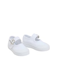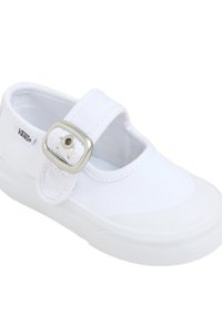 Baskets blanches en toile avec une semelle plate, un bout rond et une sangle ajustable avec une boucle en métal. Présente un logo Vans sur le côté.