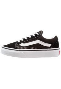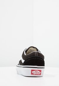 Personne portant des baskets noir et blanc avec des lacets blancs, des chaussettes blanches et un pantalon noir retroussé marchant sur un sol blanc.