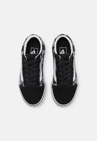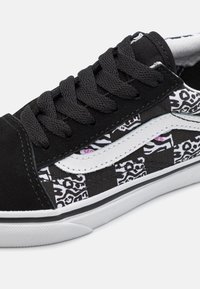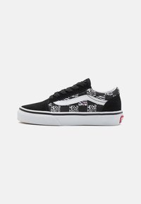 Baskets noir et blanc avec un design à motifs, en daim et toile, lacets plats, et une semelle en caoutchouc blanche avec une étiquette logo rouge.
